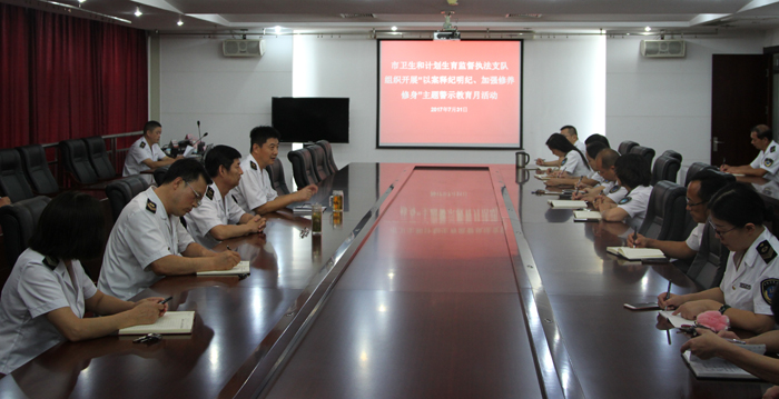 根据市卫计委党委《关于在卫生计生系统开展“以案释纪明纪、加强修养修身”主题警示教育月活动的意见》,支队结合卫生计生监督执法工作实际,合理安排集中警示教育时间,组织全体职工集中观看《警钟》警示教育片。