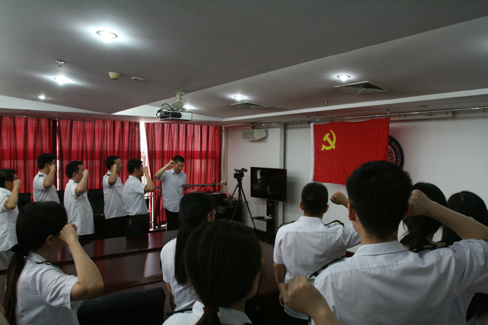 全体党员在鲜红的党旗面前列队,庄严地举起右手,在党支部书记张钦传的领誓下,铿锵有力地宣读了入党誓词,表达了对党诚挚的感情和心声。
